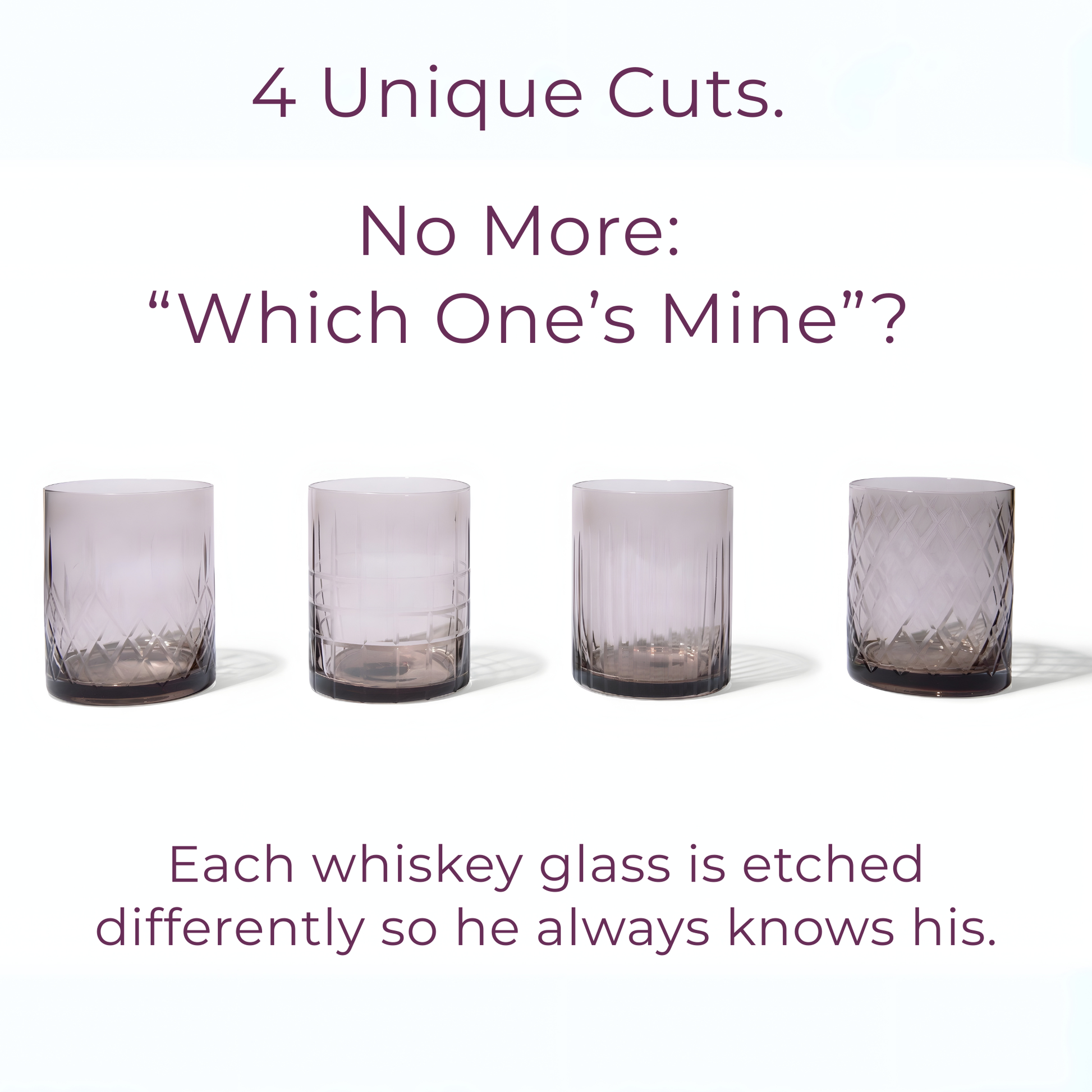 Each of these hand-blown whiskey glasses features a distinct etched pattern - so he always knows which one is his. No mix-ups. No markers. No charms.